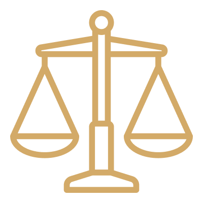 The justice scale icon represents ethical sourcing, regulatory compliance, and industry certifications.