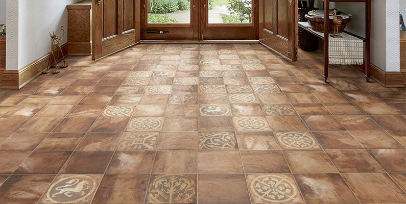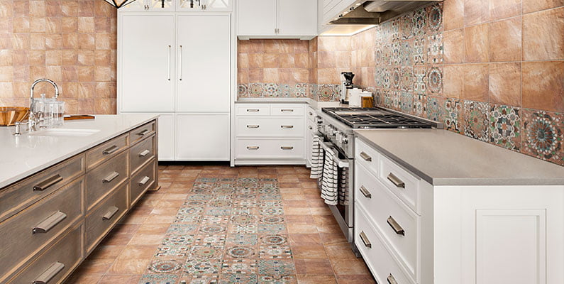 Available in solid colors (White, Cream, Cotto, Grey) and decorative variants (Teano, Sforza, Lomba, Visconti, Borghese), some showcasing intricate arabesque patterns inspired by historical hydraulic flooring.