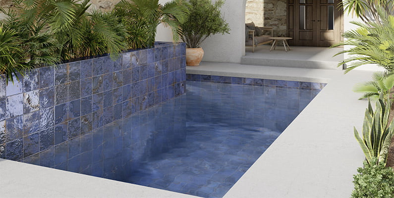 The tile is a 90 × 90 cm concrete-effect porcelain, offering urban sophistication and contemporary style. Available in both timeless neutrals (Pearl, Sand, Taupe) and trendier shades (Blue, Green, Clay, Anthracite), Meraki is designed to enhance creative and expressive environments—indoors or outdoors. - Porcelana “Meraki” Series: